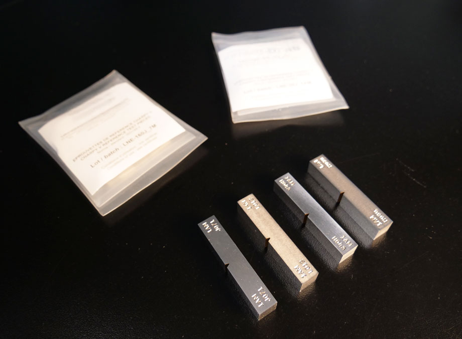 Éprouvettes standardisées pour les chocs Charpy, Izod, pour tous les matériaux.