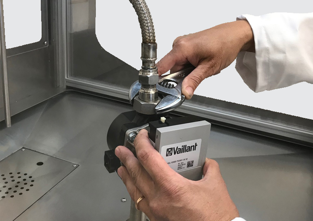 Drucktest an der Umwälzpumpe eines Heizkessels. Prüfstand für Druckfestigkeit, Lecktests und Crashtests. Sehen Sie sich unsere Fallstudien an.