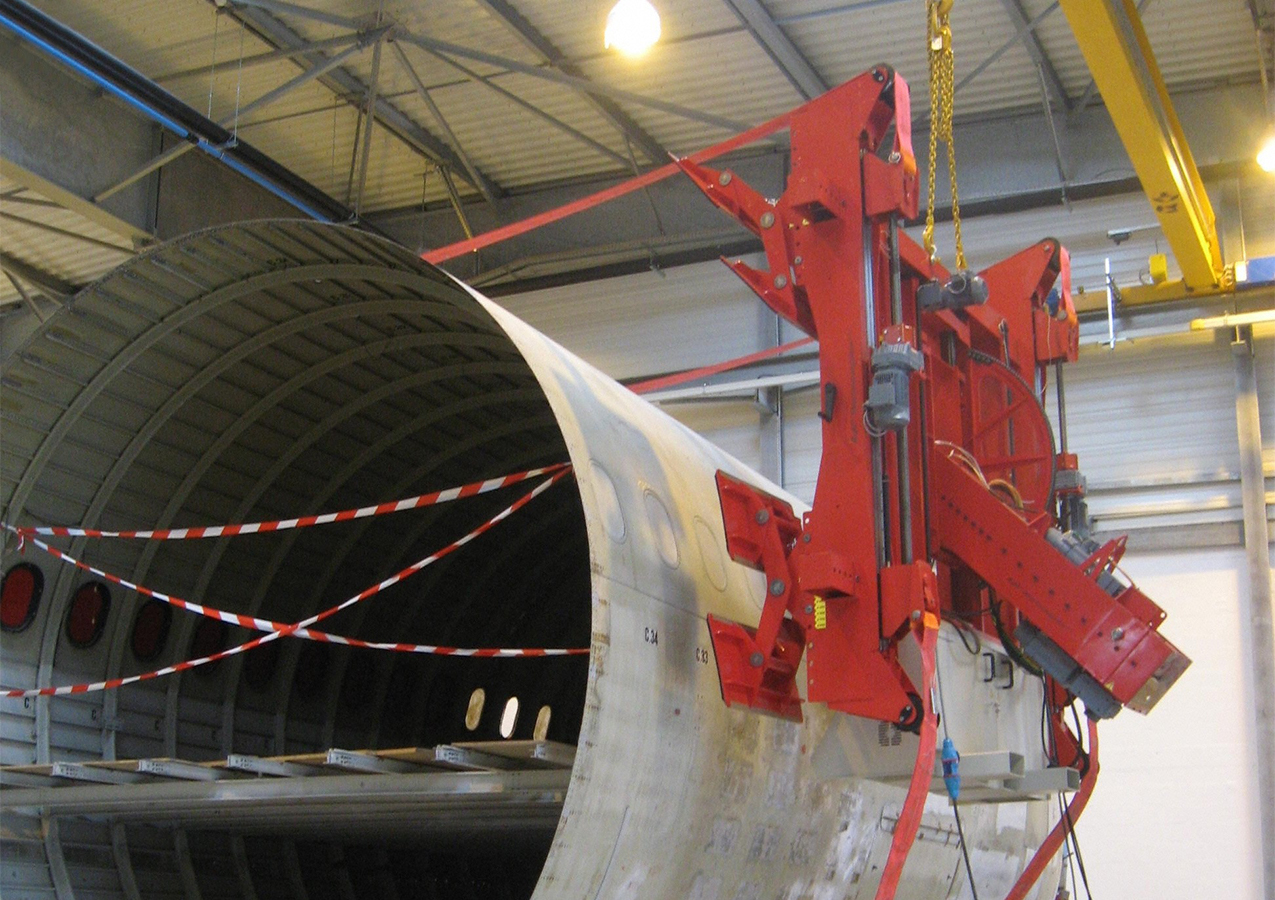 Die Maschine wird an einem Prüfgestell oder direkt an dem zu prüfenden Element aufgehängt. Die Aufhängung erfolgt mit Hilfe eines automatisch gesteuerten Spanngurtsystems, das die Verwendung eines großen Portals (z. B. für Tests an Flugzeugen) überflüssig macht.