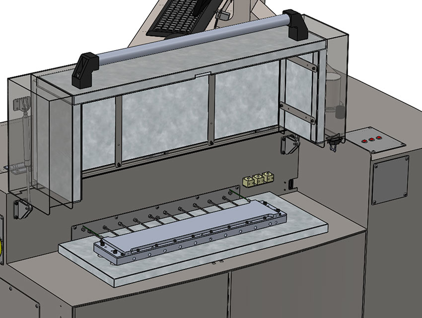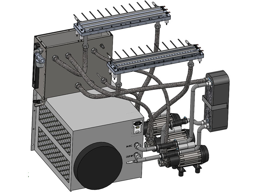 Die Heizbänder (selbstregulierend und mit konstanter Leistung) sind in einem speziellen Werkzeug eingeschlossen, das an einer Temperaturregelungsplatte befestigt ist. Die gesamte Einheit ist in einem wärmeisolierten Gehäuse eingeschlossen.