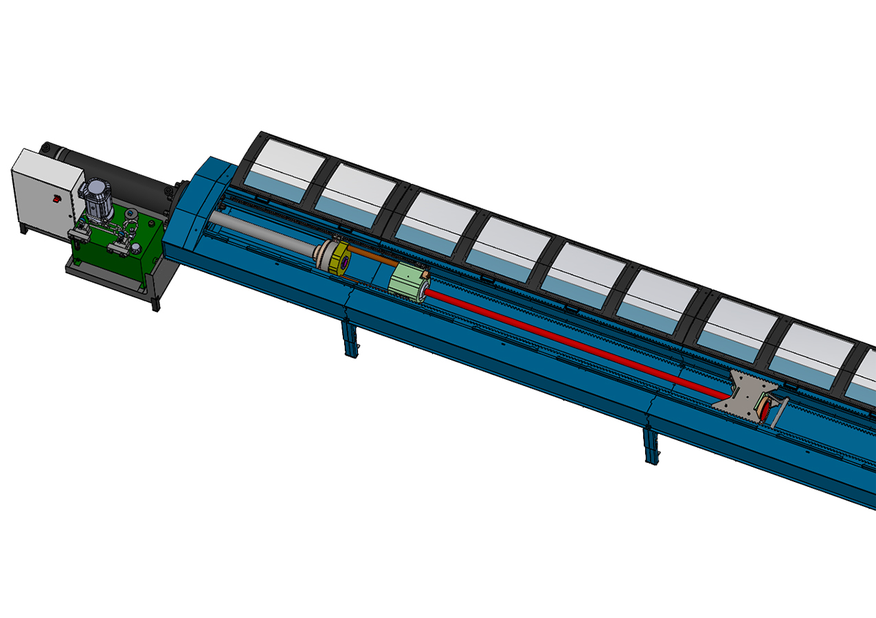 Die Ingenieure des Konstruktionsbüros entwickelten den Prüfstand mit einem Konzept identischer Module, die Ende an Ende zusammengesetzt werden, was eine perfekte Steifigkeit des Prüfstands sowie eine einfache Montage und Versendung der Testmaschine an unseren Kunden gewährleistet. Dieses Konzept ermöglicht es auch, die Länge des Prüfstands durch Hinzufügen oder Entfernen von Modulen zu verändern.
